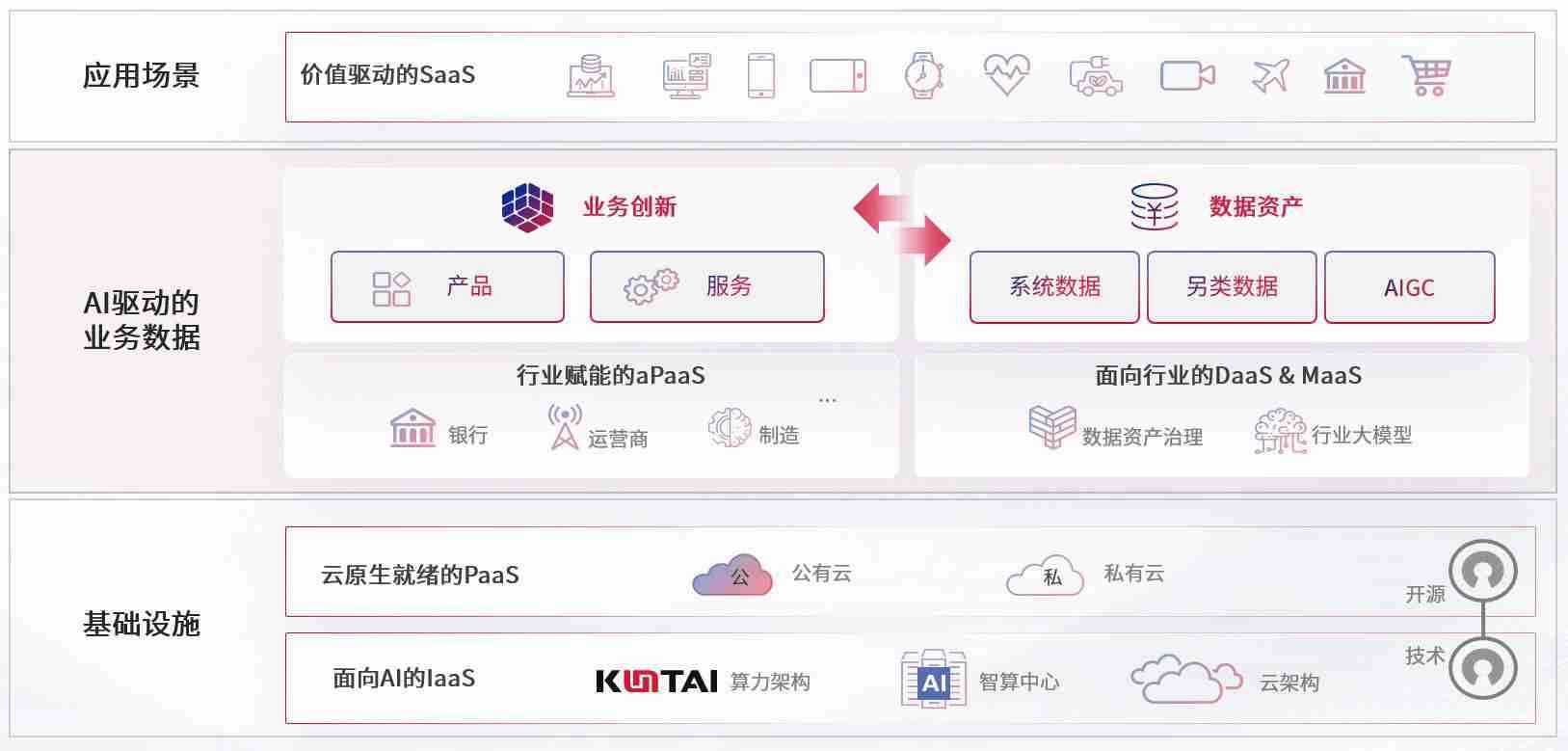 数字时代,,,,围绕企业数字化转型的关键要素,,z6com尊龙凯时数码开创性的提出数云融合战略和技术体系框架,,,着力在云原生、、、、数字原生、、、、AI原生和信创产业上架构产品和服务能力,,为处在不同数字化转型阶段的快消零售、、、、汽车、、金融、、、、医疗、、、、政企、、教育、、运营商等行业客户提供泛在的敏捷IT能力和融合的数据驱动能力,,构建跨界融合创新的数字业务场景和新业务模式,,助力企业级客户建立面向未来的核心能力和竞争优势,,,全面推动社会的数字化、、、智能化转型升级。。。。