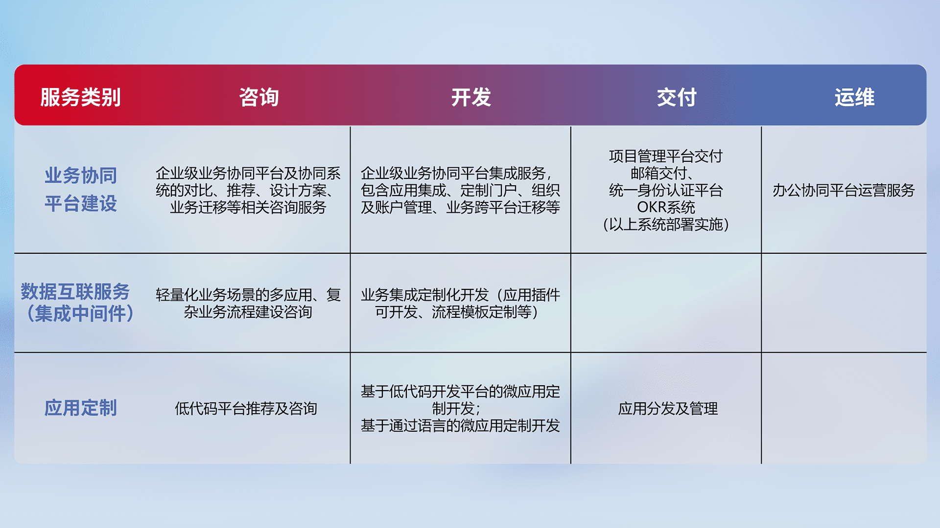 针对钉钉、、、、企微、、IDaas等平台级产品提供产品的规划、、、方案、、交付、、、定制化开发等服务,,实现如统一协同办公、、、、智能客户服务、、、混合会议管理、、、智能数据查询、、、、等业务场景,,,,实现数字化转型。。。